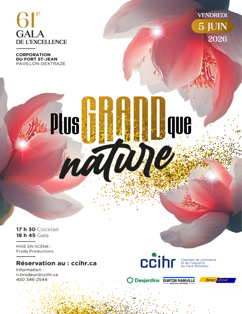 La Chambre de commerce et de l’industrie du Haut-Richelieu (CCIHR) ainsi que Desjardins, Dunton Rainville Avocats et Notaires et Spec-Dor vous invitent au 61e Gala de l’Excellence, sous le thème Plus GRAND que nature. Le Gala économique le plus prestigieux de la région fait rayonner les accomplissements des gens d’affaires et des organismes situés sur le territoire de la CCIHR, tous domaines d’activités confondus.
