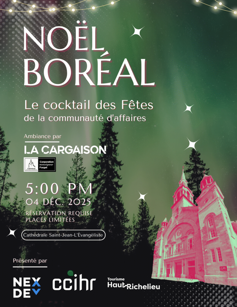 Le Cocktail des fêtes de la communauté d’affaires, conjointement présenté par NexDev et la CCIHR se tiendra cette année à la Cathédrale Saint-Jean-l’Évangéliste, en plein cœur du Vieux-Saint-Jean, avec une ambiance lumineuse et chaleureuse, grâce à LA CARGAISON.