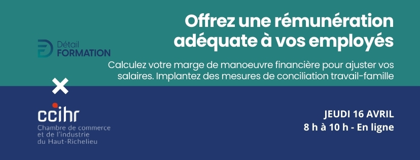 En collaboration avec Détail Formation, la CCIHR est fière de recommander la nouvelle formation en ligne : Offrez une rémunération adéquate à vos employés.